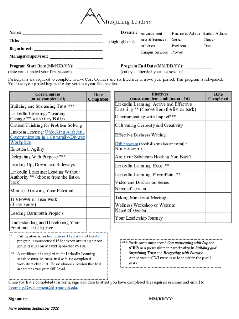 Name: ___ Title: ___Division: Advancement (highlight one)Department: ___ Manager/Supervisor: ___ Program Start Date (MM/DD/BY): ___ (date you attended your first session)Finance & Admin Student Afforests