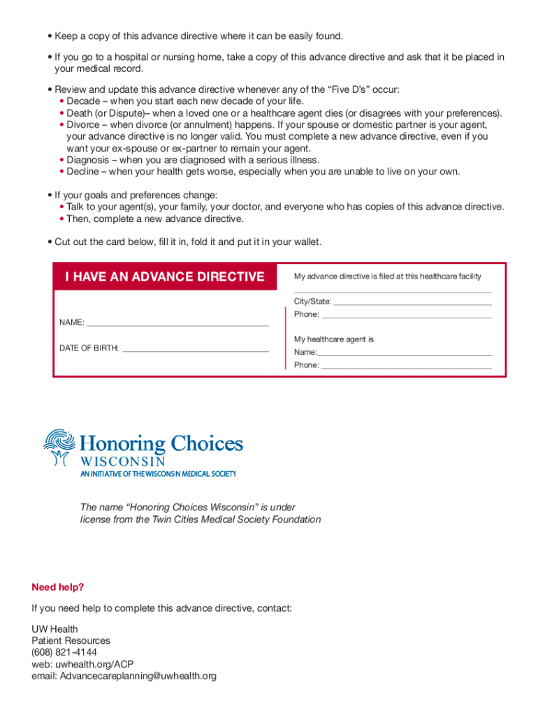 Honoring Choices WisconsinPower of Attorney for Healthcare Cover Page: Do not scanOverview This legal document meets the requirements for Wisconsin. It lets you: Name another person to make your healthcare