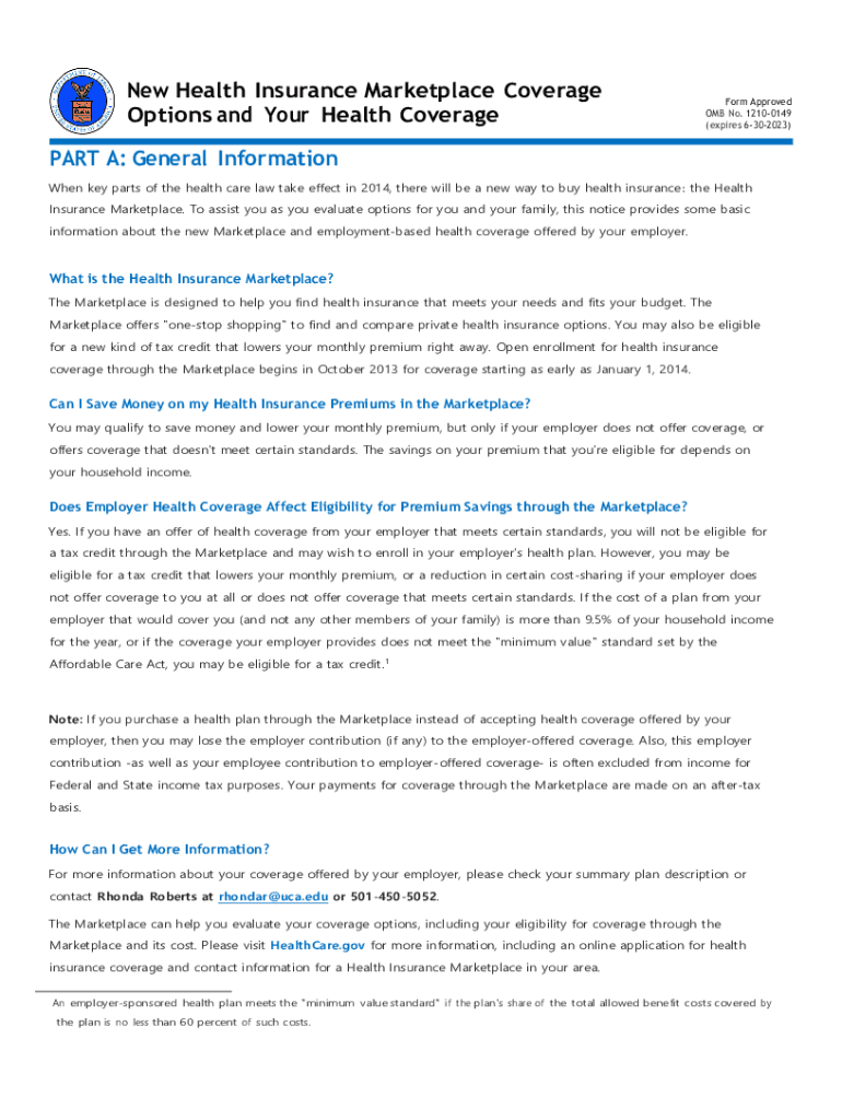 New Health Insurance Marketplace Coverage Options and Your Health CoverageForm Approved OMB No. 12100149 (expires 6302023)PART A: General Information When key parts of the health care law take effect