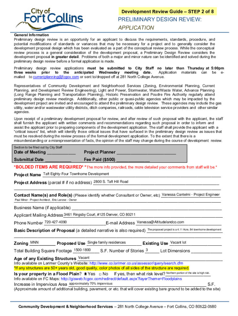 Preliminary Design Review Agenda Reschedule for 08/26/20Wednesday, August 26, 2020, TimeProject NameApplicant InfoProject Description8:302800 S Taft Hill Rd TownhomesVanessa Canceled 7204274090 Vanessa@altitudelandco.comThis