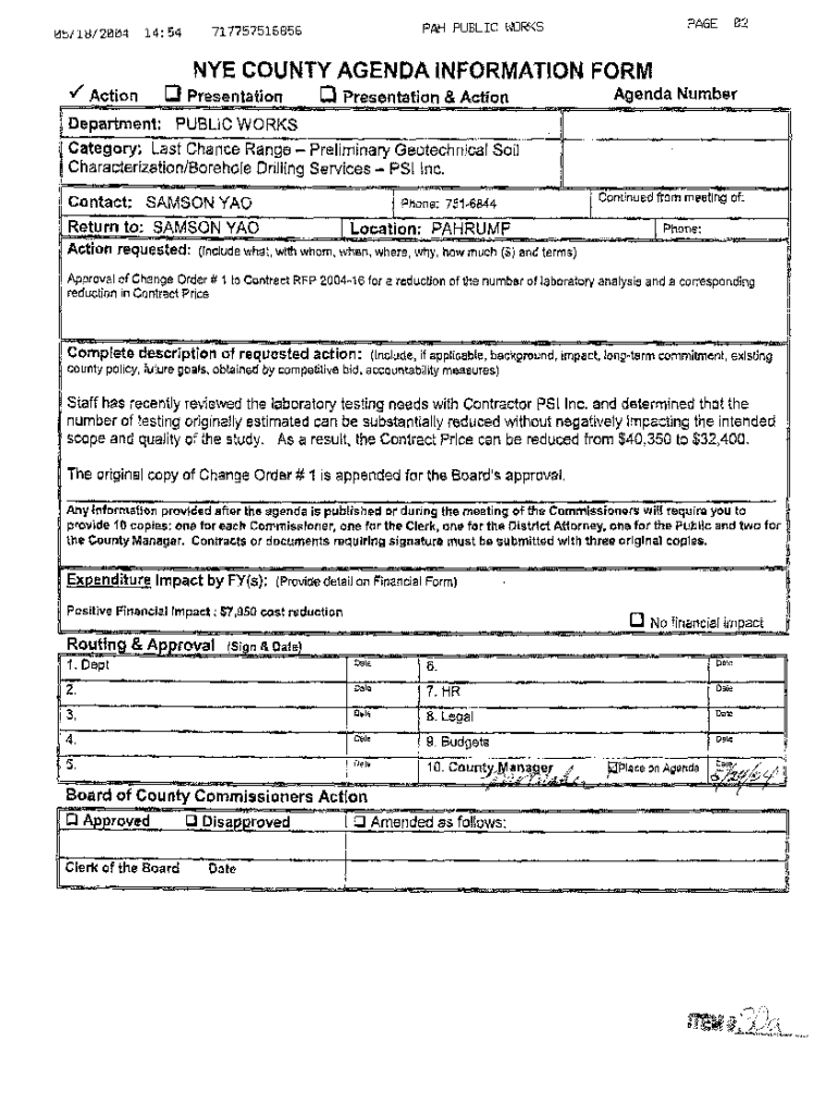 PAGE PAH PUBLIC WORKS02NYE COUNTY AGENDA INFORMATION FORM4 Action Presentation & ActionAgenda NumberAppmval of Change Order # 1 to Contract RFP 200416 for a reduction of the number of laboratory analysis
