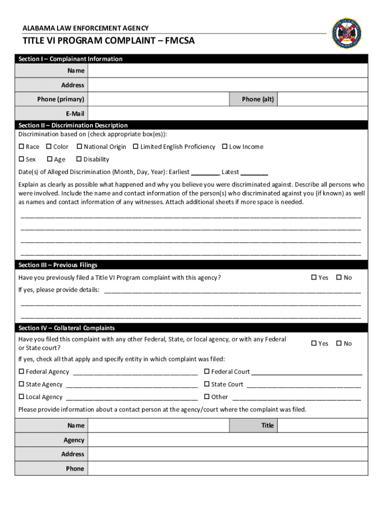 Get the free alabama law enforcement agency - title vi program complaint fmcsa