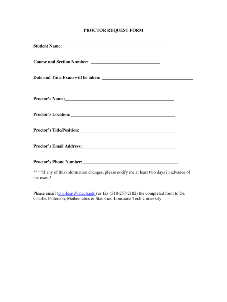 PROCTOR REQUEST FORMStudent Name:___Course and Section Number: ___Date and Time Exam will be taken: ___Proctors Name:___Proctors Location:___Proctors Title/Position:___Proctors Email Address:___Proctors