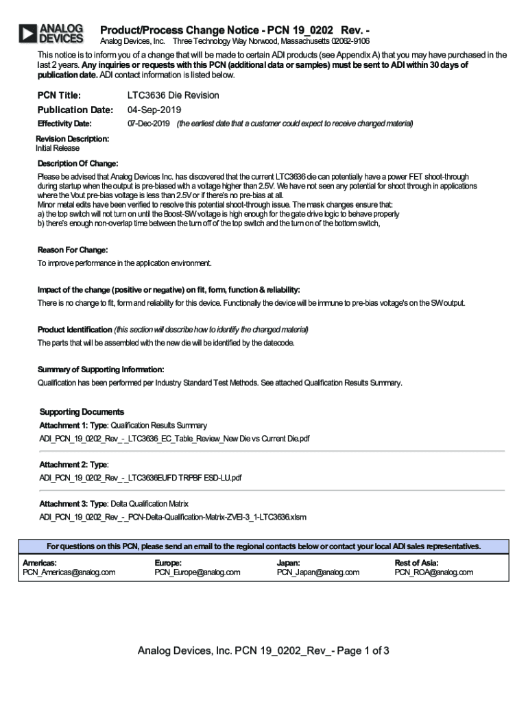 Product/Process Change Notice PCN 19_0202 Rev. Analog Devices, Inc. Three Technology Way Norwood, Massachusetts 020629106This notice is to inform you of a change that will be made to certain ADI products
