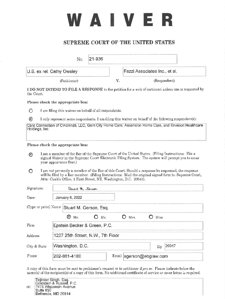WAIVER SUPREME COURT OF THE T]NOTED STATES 21936No. Jazz Associates Inc., ET ALU. S. ex rel. Cathy Wesley(Petitioner)V. I DO NOT INTEND TO FILE A RESPONSE@espondent)to the petition for await of certiorari