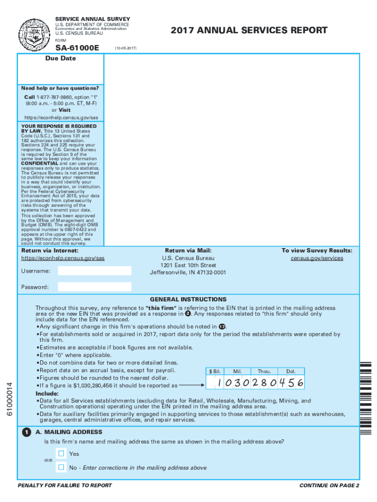 SERVICE ANNUAL SURVEY U.S. DEPARTMENT OF COMMERCE Economics and Statistics Administration. S. CENSUS BUREAU2017 ANNUAL SERVICES REPORTFORMSA61000E(10052017)Due Patented help or have questions? Call