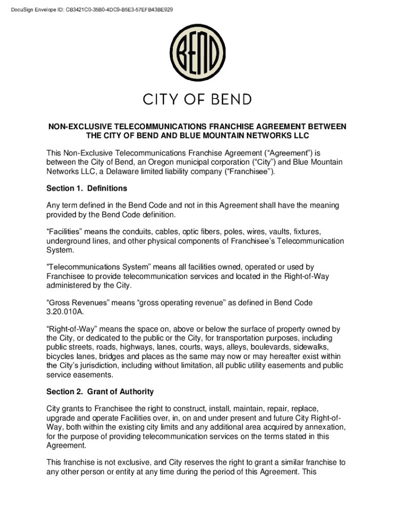 DocuSign Envelope ID: CB3421C035B04DC9B5E357EFB43BE929NONEXCLUSIVE TELECOMMUNICATIONS FRANCHISE AGREEMENT BETWEEN THE CITY OF BEND AND BLUE MOUNTAIN NETWORKS LLC This Nonexclusive Telecommunications