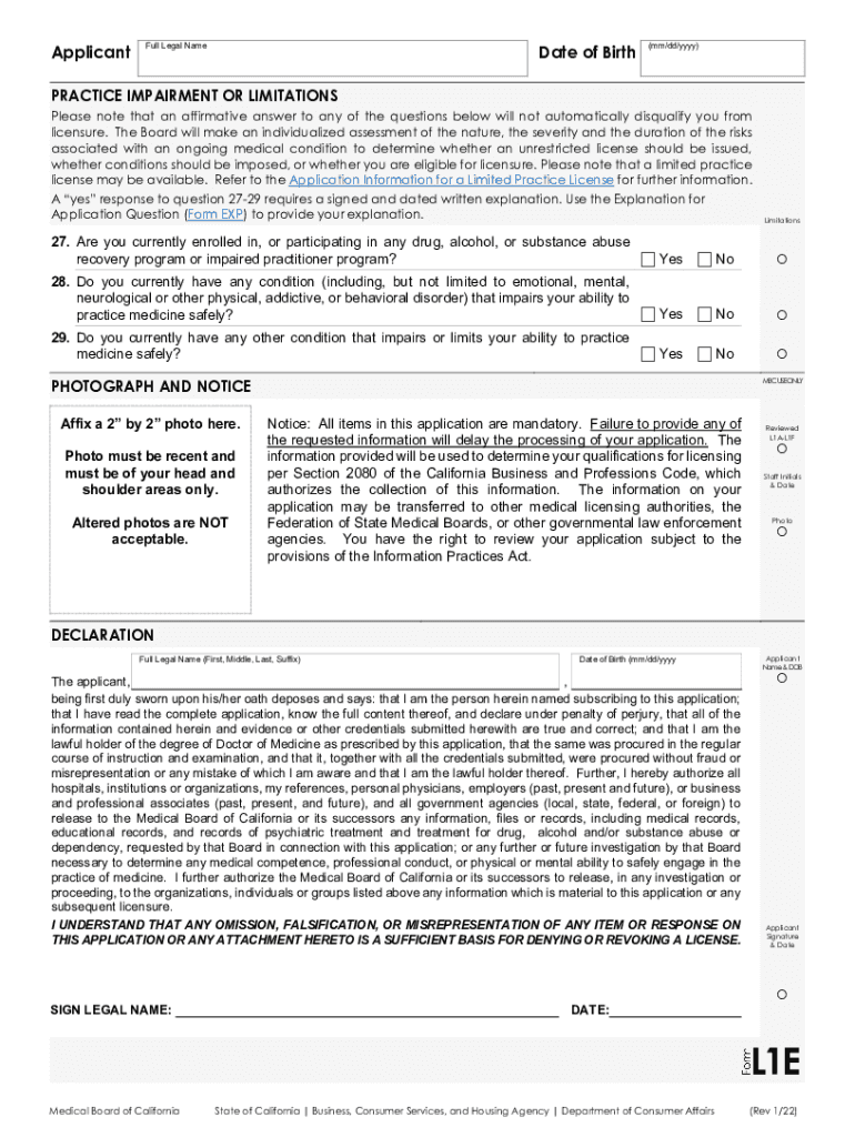 ApplicantDate of Mirthful Legal Name(mm/dd/YYY)PRACTICE IMPAIRMENT OR LIMITATIONS Please note that an affirmative answer to any of the questions below will not automatically disqualify you from licensure.