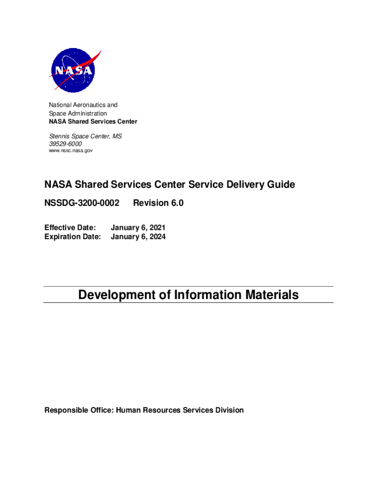National Aeronautics and Space Administration NASA Shared Services Center Tennis Space Center, MS 395296000 www.nssc.nasa.govNASA Shared Services Center Service Delivery Guide NSSDG32000002 Effective