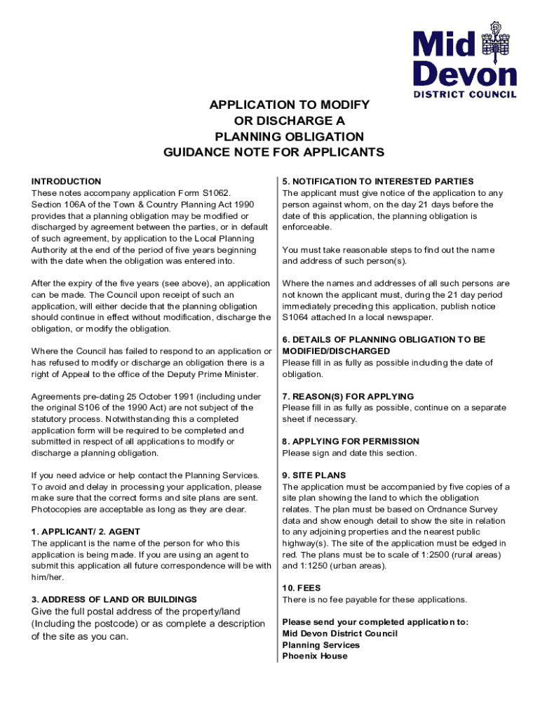 APPLICATION TO MODIFY OR DISCHARGE A PLANNING OBLIGATION GUIDANCE NOTE FOR APPLICANTS INTRODUCTION These notes accompany application Form S1062. Section 106A of the Town & Country Planning Act 1990
