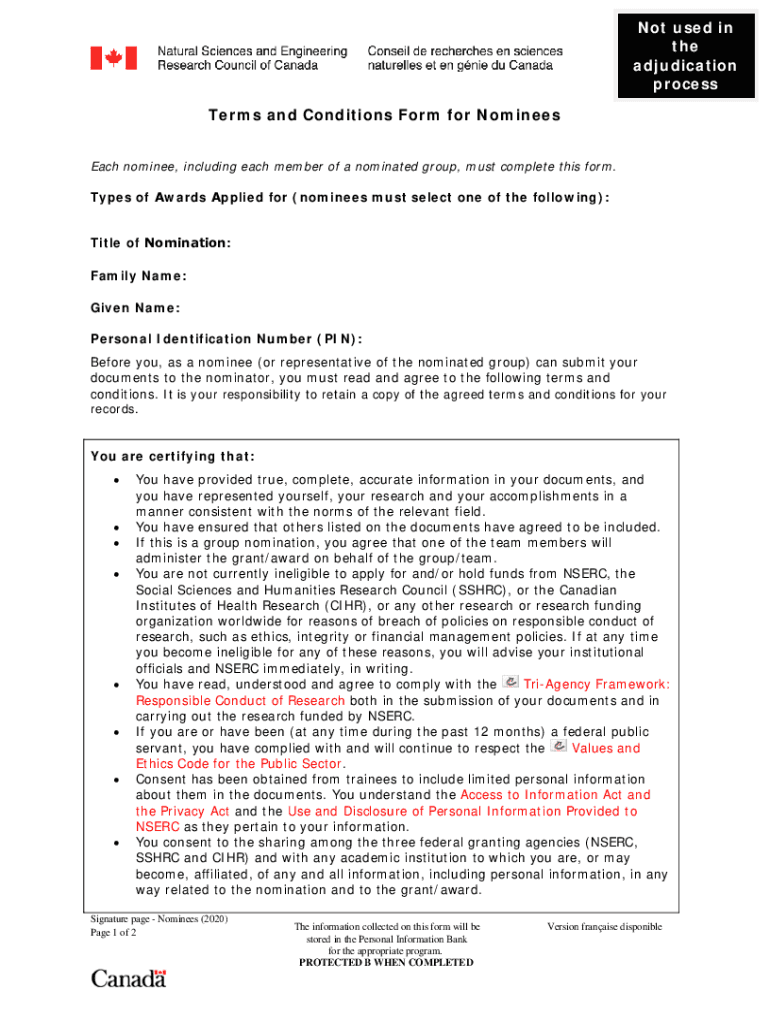 Not used in the adjudication process Terms and Conditions Form for Nominees Each nominee, including each member of a nominated group, must complete this form. Types of Awards Applied for (nominees