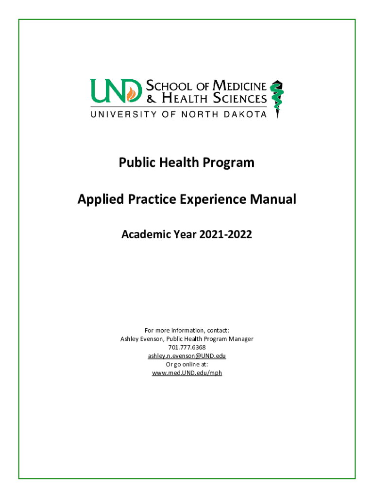 Public Health Program Applied Practice Experience Manual Academic Year 20212022For more information, contact: Ashley Evensong, Public Health Program Manager 701.777.6368 ashley.n.evenson@UND.edu Or