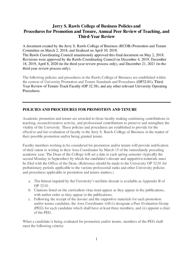 Jerry S. Rails College of Business Policies and Procedures for Promotion and Tenure, Annual Peer Review of Teaching, and Thirstier Review A document created by the Jerry S. Rails College of Business