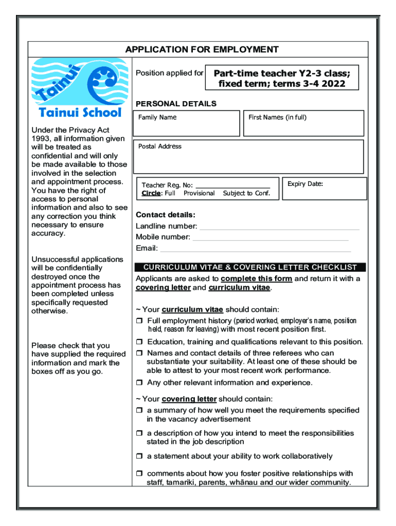 APPLICATION FOR EMPLOYMENT Position applied forParttime teacher Y23 class; fixed term; terms 34 2022PERSONAL DETAILS Family Amended the Privacy Act 1993, all information given will be treated as confidential