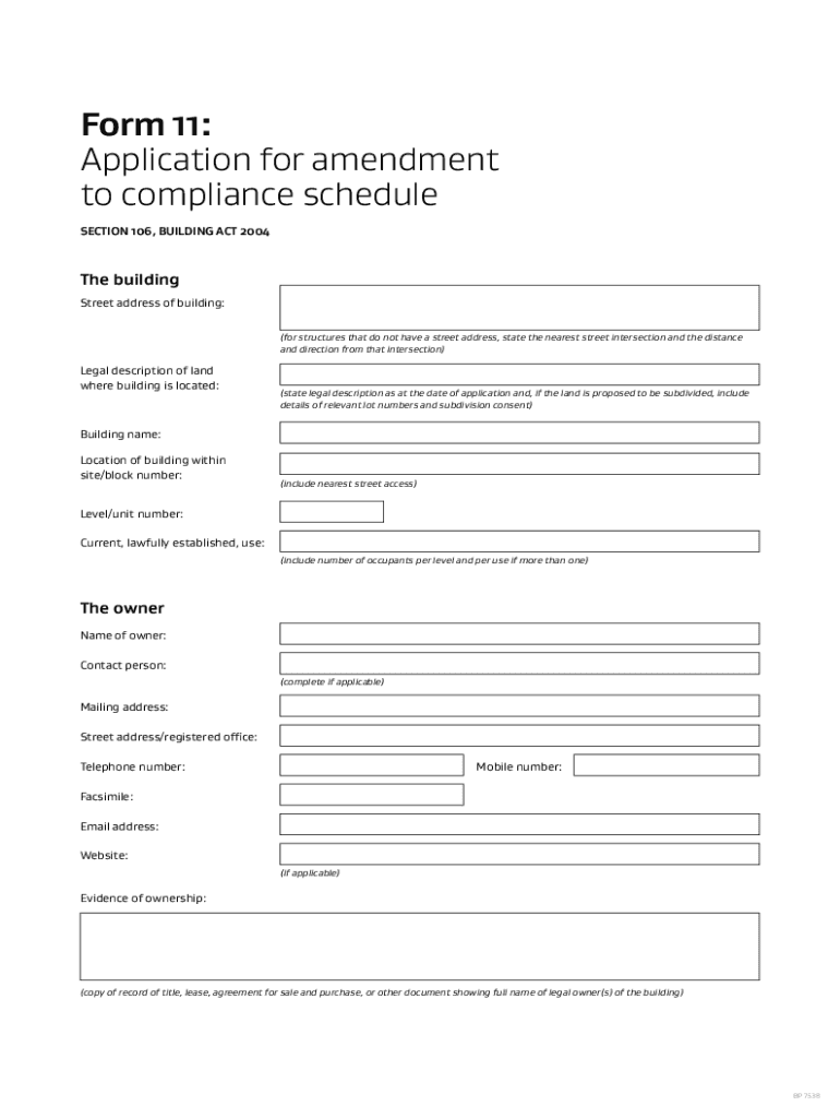 Form 11: Application for amendment to compliance schedule SECTION 106, BUILDING ACT 2004The building Street address of building:(for structures that do not have a street address, state the nearest