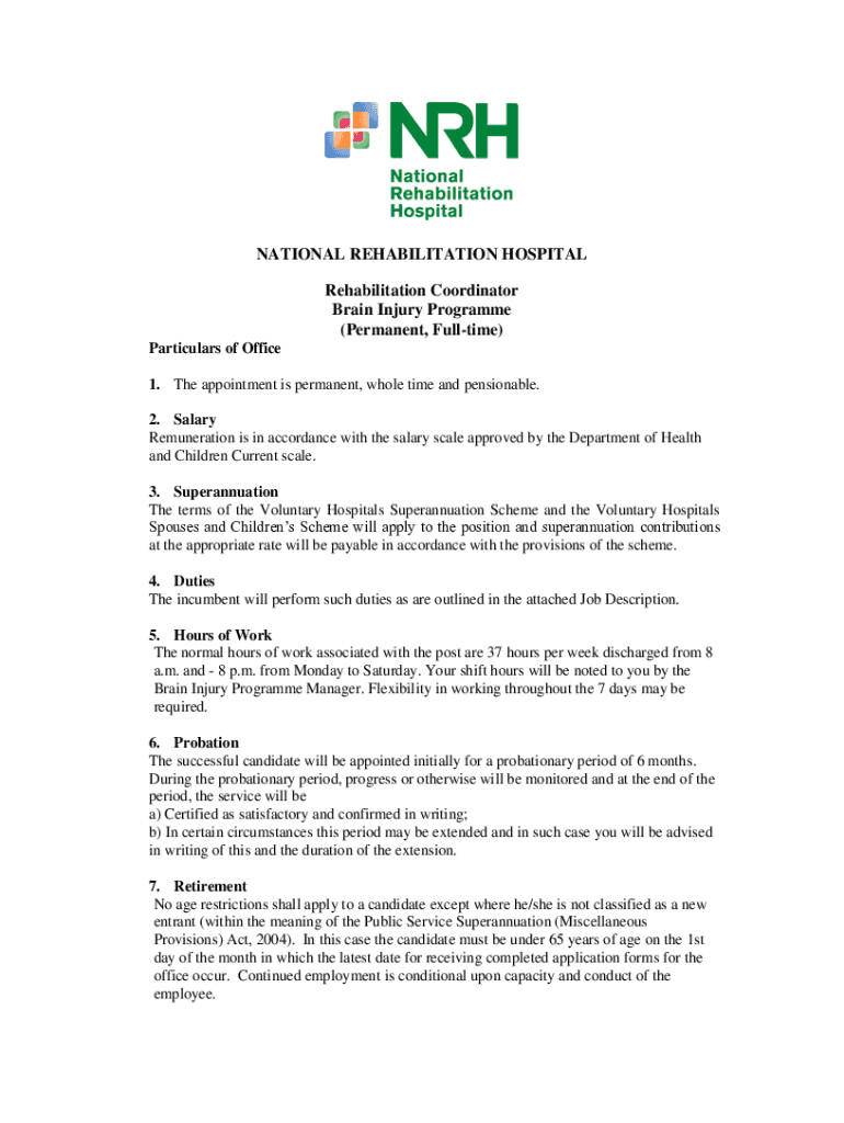 NATIONAL REHABILITATION HOSPITAL Rehabilitation Coordinator Brain Injury Program (Permanent, Full time) Particulars of Office 1. The appointment is permanent, whole time and pensionable. 2. Salary