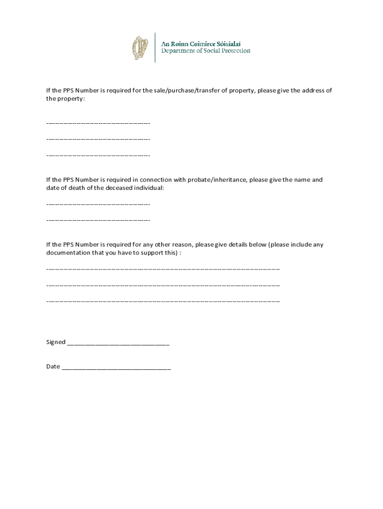 If the PPS Number is required for the sale/purchase/transfer of property, please give the address of the property:If the PPS Number is required in connection with probate/inheritance, please give