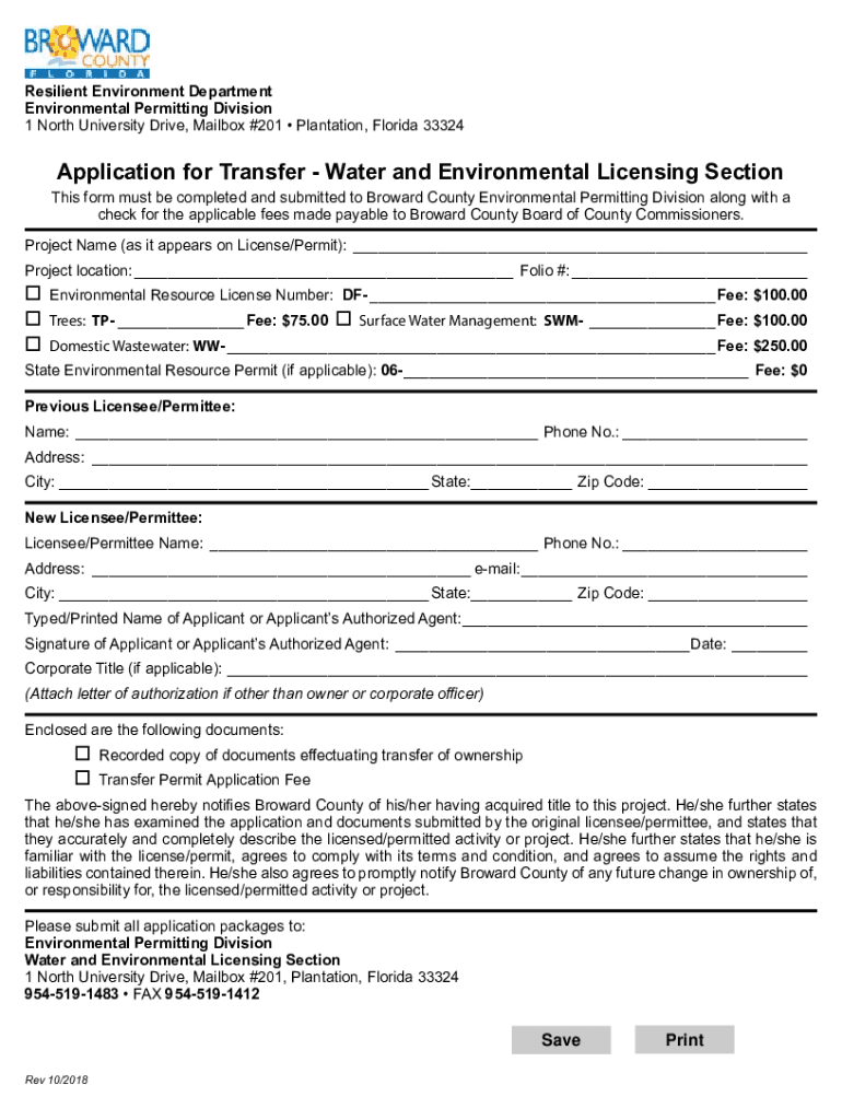 Resilient Environment Department Environmental Permitting Division 1 North University Drive, Mailbox #201 Plantation, Florida 33324Application for Transfer Water and Environmental Licensing Sections