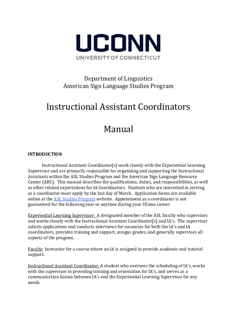 Department of Linguistics American Sign Language Studies ProgramInstructional Assistant Coordinators Manual INTRODUCTION Instructional Assistant Coordinator(s) work closely with the Experiential Learning