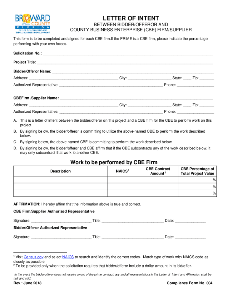Toward COUNTY FLORIDA OFFICE OF ECONOMIC AND SMALL BUS LESS DEVELOPMENTLETTER OF INTENT BETWEEN BIDDER/OFFER OR AND COUNTY BUSINESS ENTERPRISE (CBE) FIRM/Suppliers form is to be completed and signed