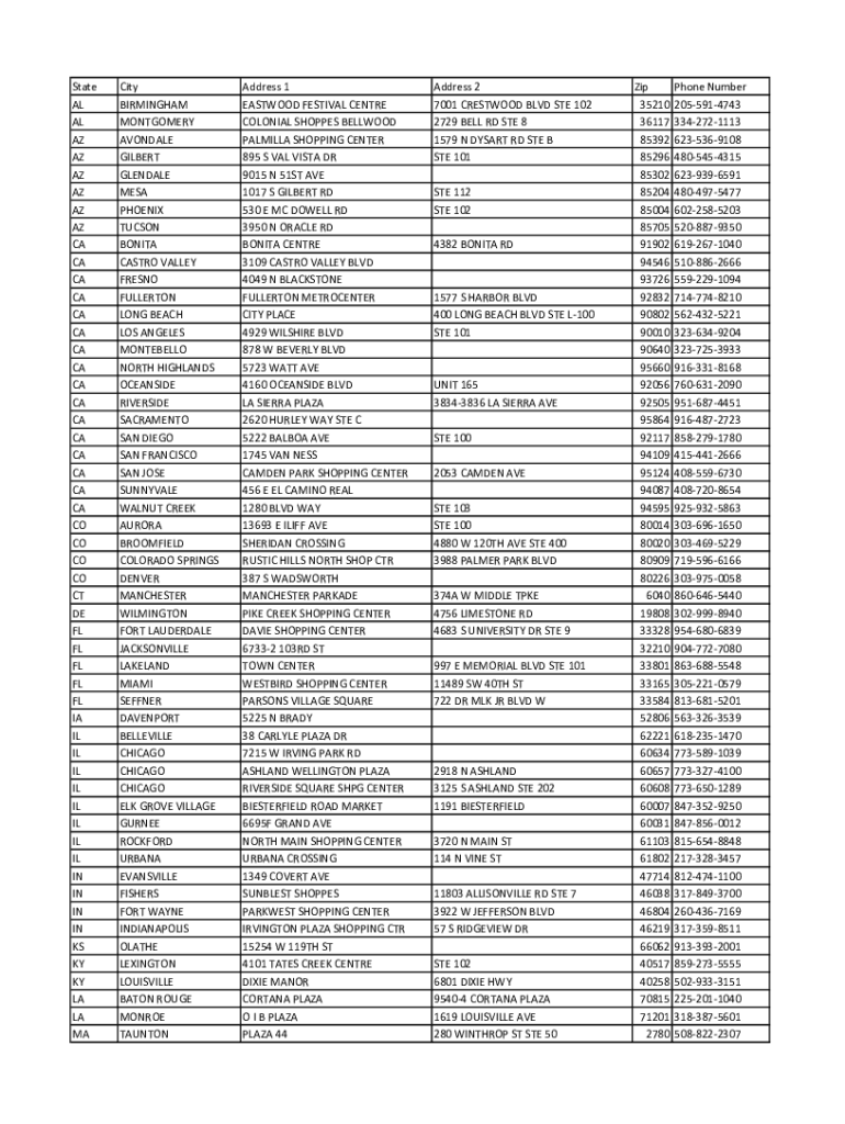 State AL AZ CA CO CT DE FL FL FL FL FL IA IL IL IL IL IL IL IL IL IN KS KY LA LA City BIRMINGHAM MONTGOMERY AVONDALE GILBERT GLENDALE MESA PHOENIX TUCSON BONITA CASTRO VALLEY FRESNO FULLERTON LONG
