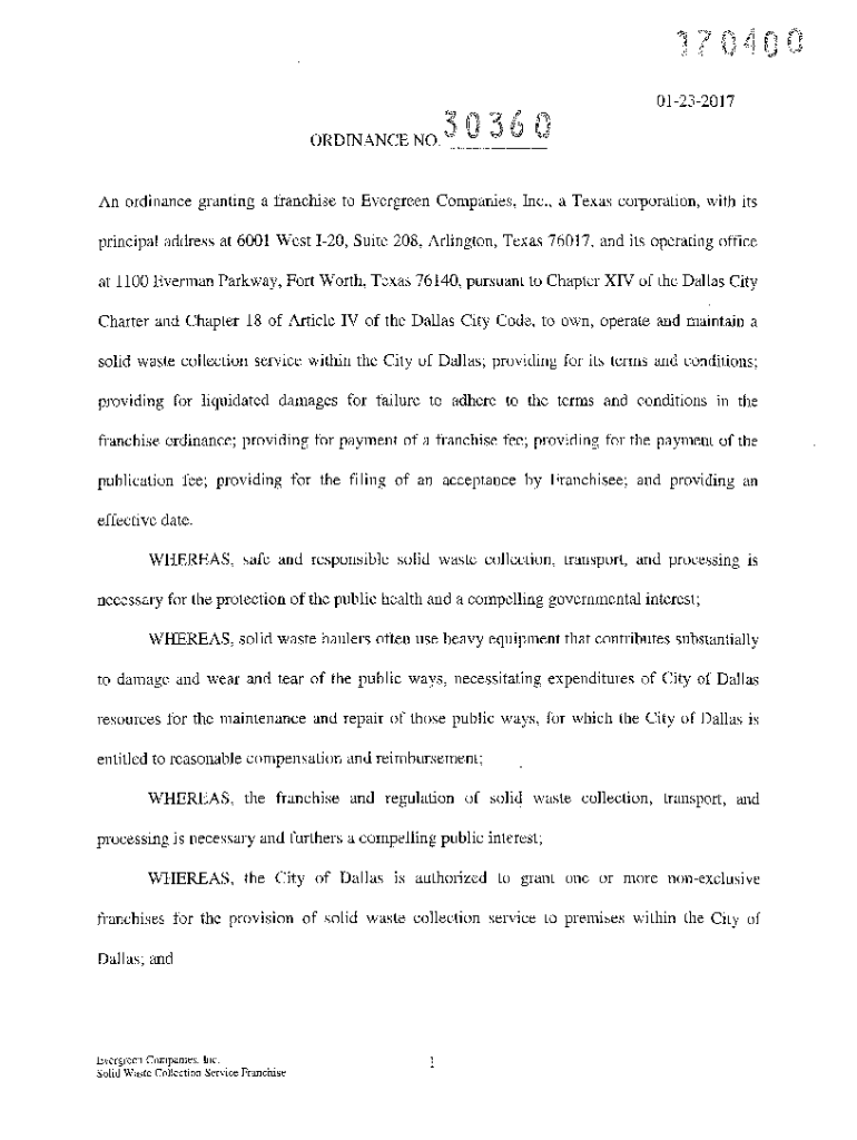 01232017 ORDINANCE_0 3 NO.36 0An ordinance granting a franchise to Evergreen Companies, Inc., a Texas corporation, with its principal address at 6001 West 120, Suite 208, Arlington, Texas 76017, and