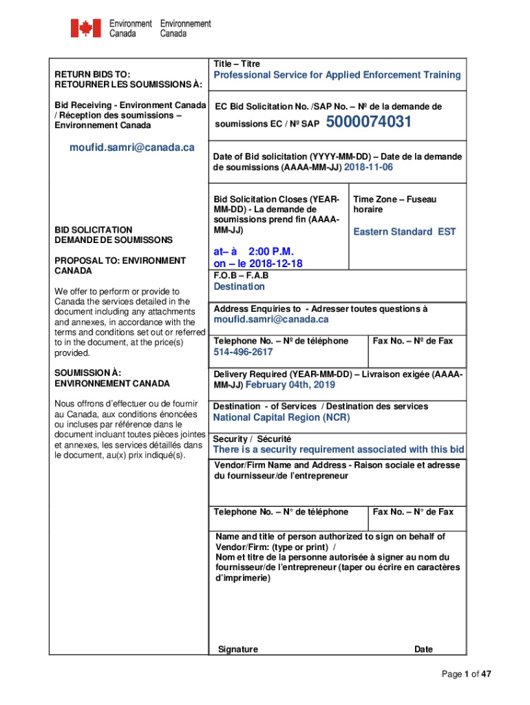 Title RETURN BIDS TO: RETURNER LES COMMISSIONS :Professional Service for Applied Enforcement Training Receiving Environment Canada / Reception DES sou missions Environment Canada EC Bid Solicitation