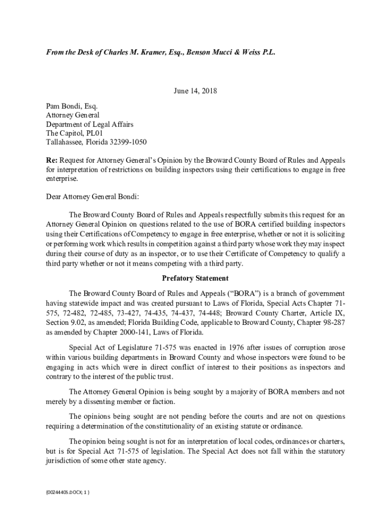 From the Desk of Charles M. Kramer, Esq., Benson Gucci & Weiss P.L. June 14, 2018, Pam Bond, Esq. Attorney General Department of Legal Affairs The Capitol, PL01 Tallahassee, Florida 323991050 Re: