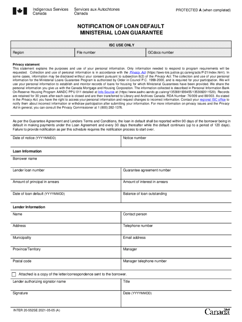 PROTECTED A (when completed)NOTIFICATION OF LOAN DEFAULT MINISTERIAL LOAN GUARANTEE ISC USE ONLY Regional numberGCdocs numberPrivacy statement This statement explains the purposes and use of your