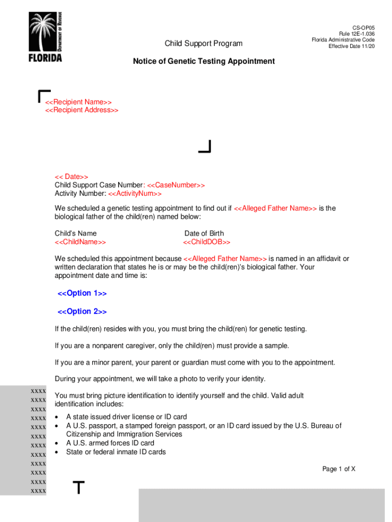 Child Support ProgramCSOP05 Rule 12E1.036 Florida Administrative Code Effective Date 11/20Notice of Genetic Testing AppointmentRecipient Name Recipient Address Date Child Support Case Number: Renumber