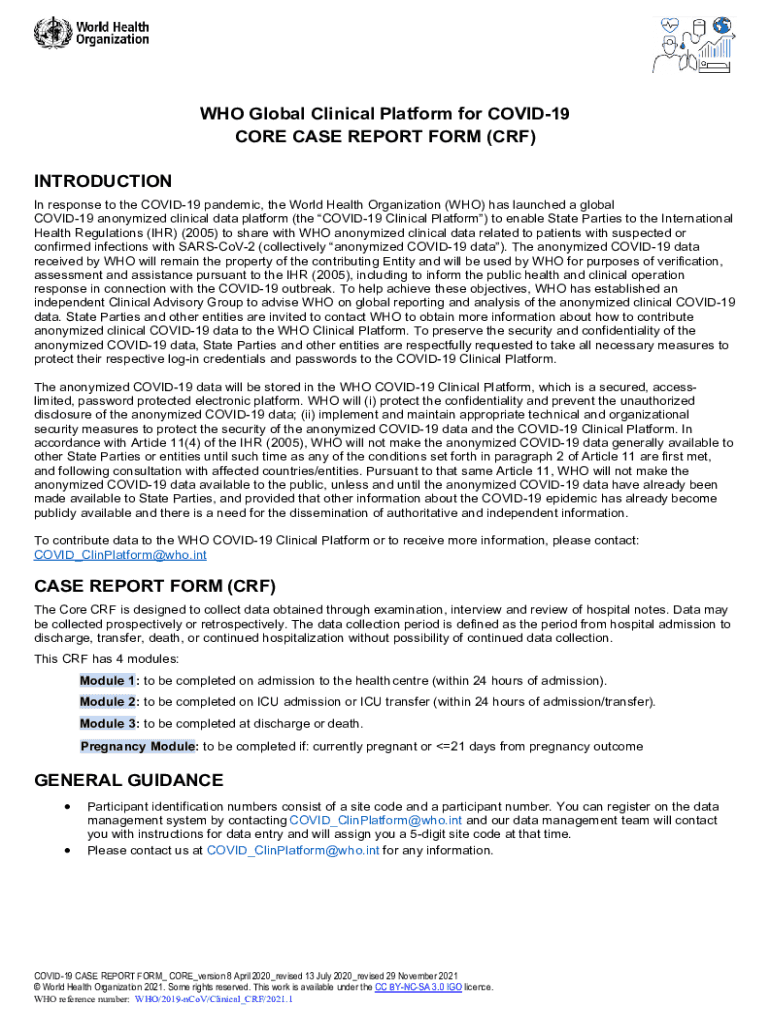 WHO Global Clinical Platform for COVID-19 CORE CASE REPORT FORM (CRF) INTRODUCTION In response to the COVID-19 pandemic, the World Health Organization (WHO) has launched a global COVID-19 anonymized