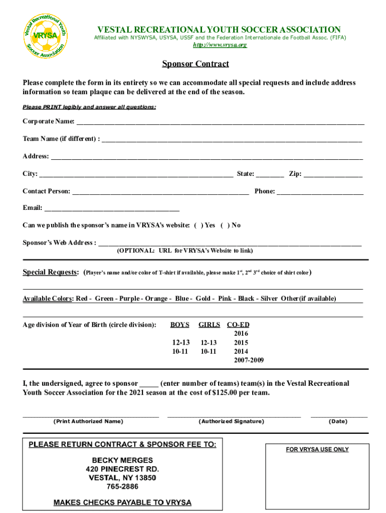 VESTAL RECREATIONAL YOUTH SOCCER ASSOCIATIONAffiliated with NYASA, USES, USSR and the Federation Internationale de Football Assoc. (FIFA)http://www.vrysa.orgSponsor Contract Please complete the form