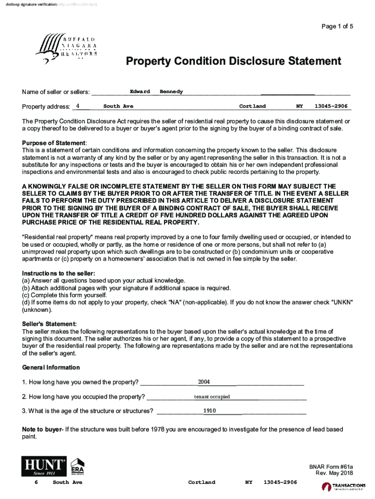 Dot loop signature verification: dtlp.us/I8Bu2efn4pUJPage 1 of 5Property Condition Disclosure Statement Edward R Kennedy Peter P Kennedy Name of seller or sellers: ___ South Ave Cortland NY 130452906