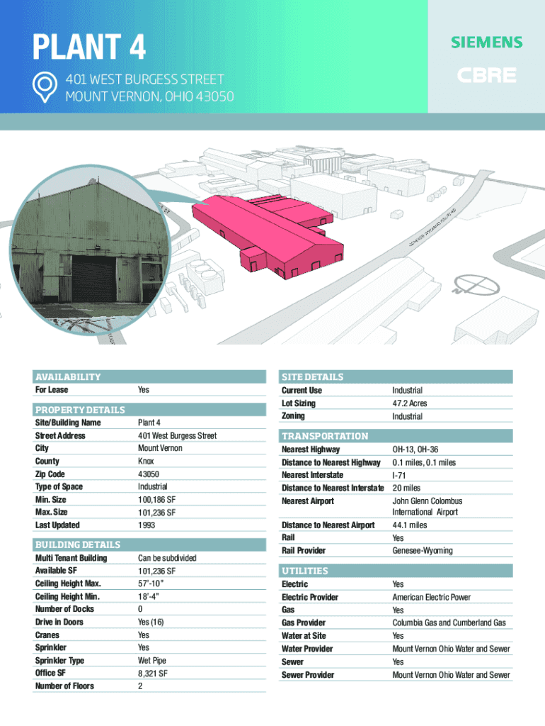 PLANT 4 401 WEST BURGESS STREET MOUNT VERNON, OHIO 43050AVAILABILITY For LeaseYesPROPERTY DETAILS Site/Building Name Street Address City County Zip Code Type of Space Min. Size Max. Size Last UpdatedPlant