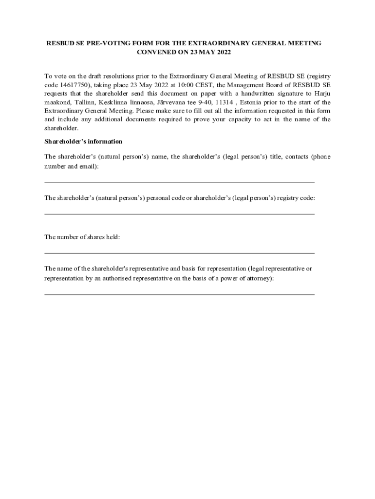 RES BUD SE PROMOTING FORM FOR THE EXTRAORDINARY GENERAL MEETING CONVENED ON 23 MAY 2022To vote on the draft resolutions prior to the Extraordinary General Meeting of RES BUD SE (registry code 14617750),
