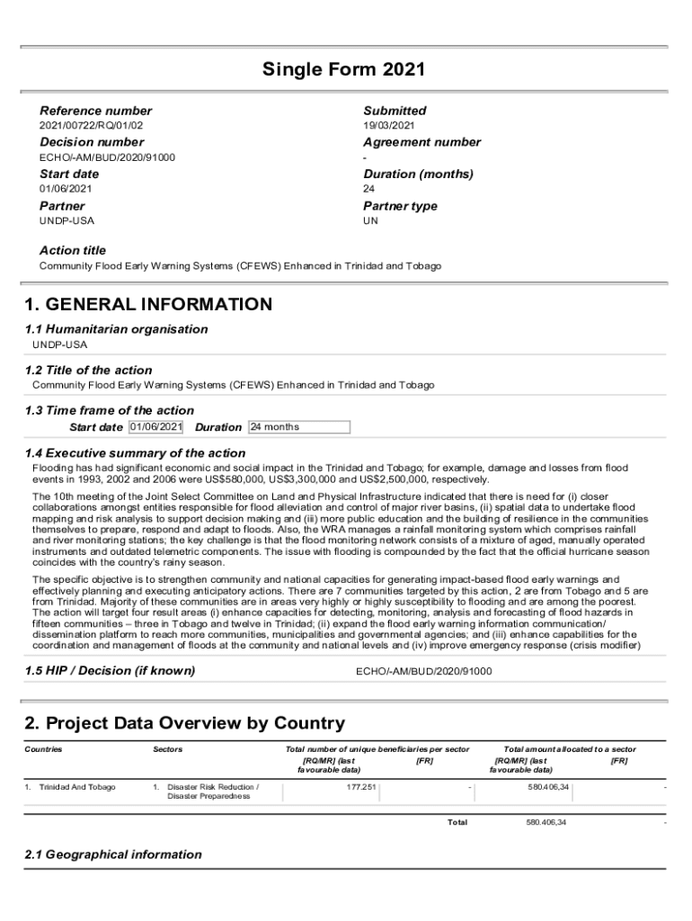 Single Form 2021 Reference numberSubmitted2021/00722/RQ/01/0219/03/2021Decision numberAgreement numbered/AM/BUD/2020/91000Start maturation (months)01/06/202124PartnerPartner typeUNDPUSAUNAction title