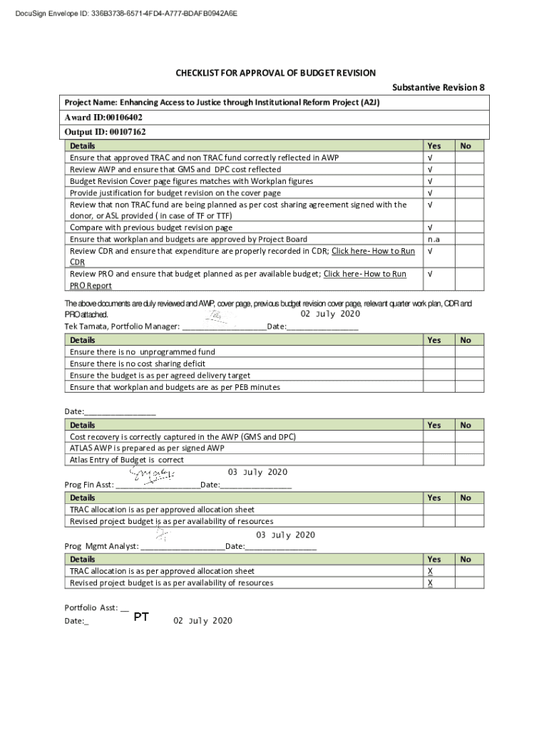 DocuSign Envelope ID: 336B373865714FD4A777BDAFB0942A6ECHECKLIST FOR APPROVAL OF BUDGET REVISION Substantive Revision 8 Project Name: Enhancing Access to Justice through Institutional Reform Project