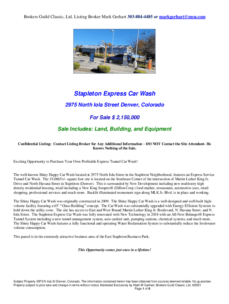 Brokers Guild Classic, Ltd. Listing Broker Mark Ger hart 3038844485 or markgerhart@msn.comStapleton Express Car Wash 2975 North Iowa Street Denver, Colorado For Sale $2,150,000 Sale Includes: Land,