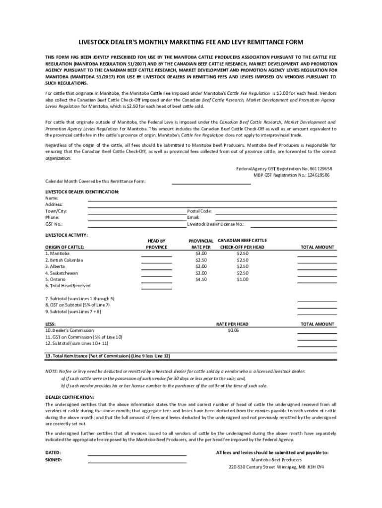 LIVESTOCK DEALER\'S MONTHLY MARKETING FEE AND LEVY REMITTANCE FORM THIS FORM HAS BEEN JOINTLY PRESCRIBED FOR USE BY THE MANITOBA CATTLE PRODUCERS ASSOCIATION PURSUANT TO THE CATTLE FEE REGULATION