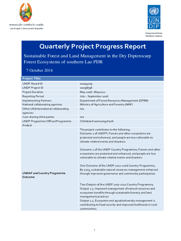Lao People\'s Democratic RepublicQuarterly Project Progress Report Sustainable Forest and Land Management in the Dry Dipterocarp Forest Ecosystems of southern Lao DR 7 October 2016 Project Title: