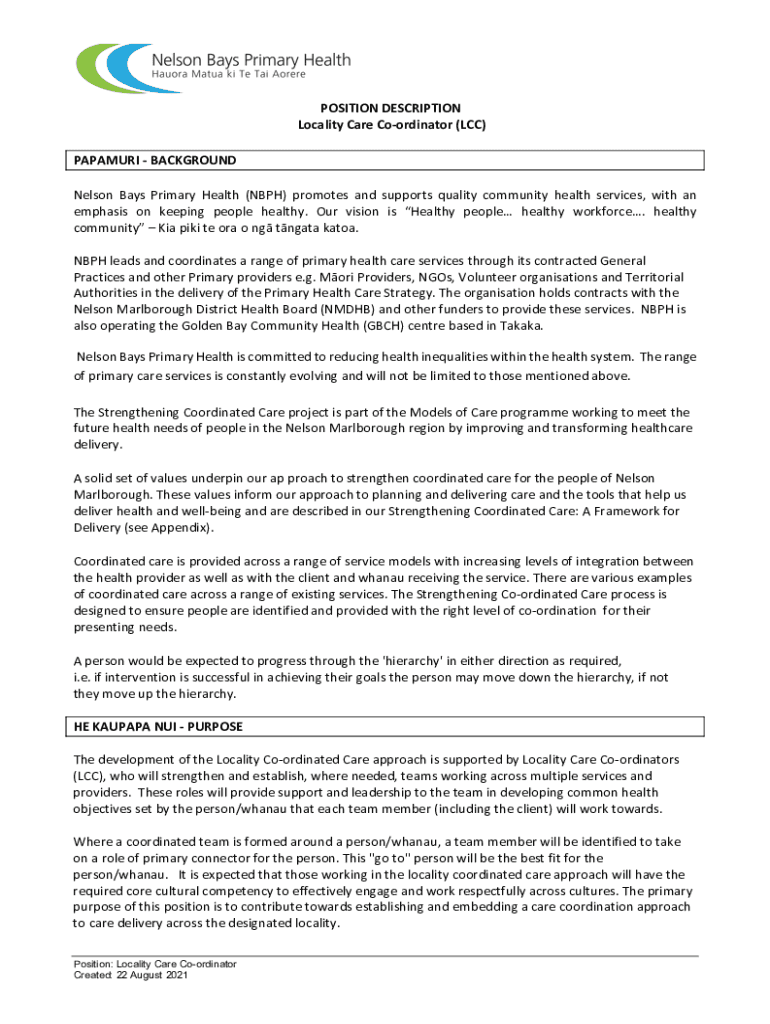 POSITION DESCRIPTION Locality Care Coordinator (LCC) PAPYRI BACKGROUND Nelson Bays Primary Health (BPH) promotes and supports quality community health services, with an emphasis on keeping people