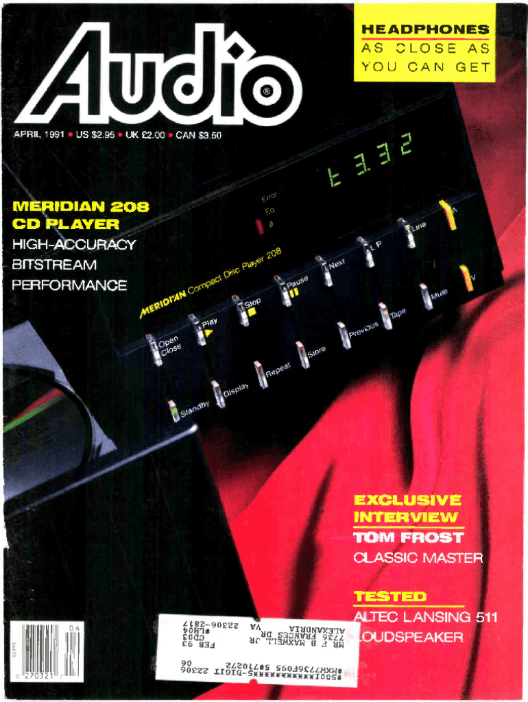HEADPHONES AS CLOSE AS YOU CAN APRIL 1991\'US$2.95UK 2.00CAN $3.50MERIDIAN 208 CD PLAYER HIGH CURACY. LEB ITSTREAMve, pact CSPERFORMANCEPauseCOMa0`Anode \', Just,ayPe9PeosEXCLUSIVE INTERVIEW TOM FROST