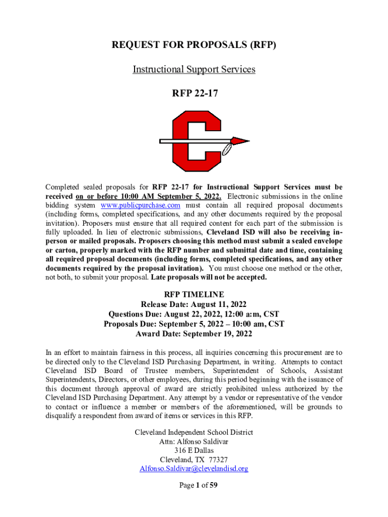 REQUEST FOR PROPOSALS (RFP) Instructional Support Services RFP 2217Completed sealed proposals for RFP 2217 for Instructional Support Services must be received on or before 10:00 AM September 5, 2022.