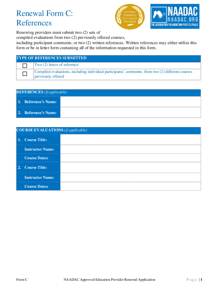 Renewal Form C: References Renewing providers must submit two (2) sets of compiled evaluations from two (2) previously offered courses, including participant comments, or two (2) written references.