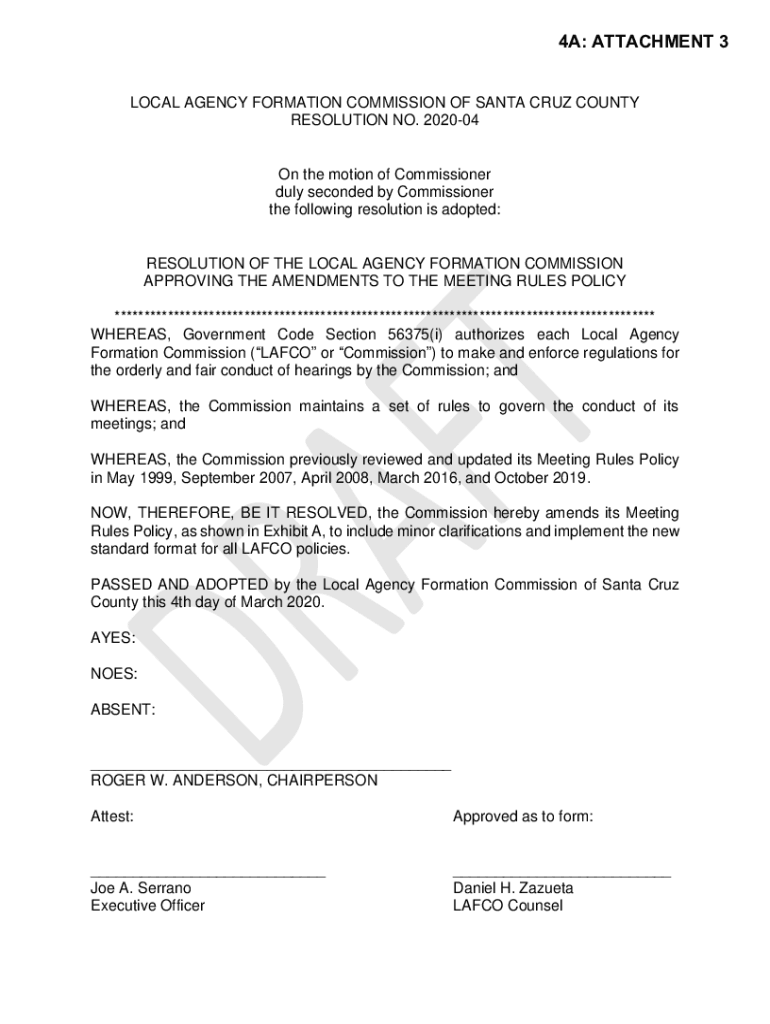 4A: ATTACHMENT 3 LOCAL AGENCY FORMATION COMMISSION OF SANTA CRUZ COUNTY RESOLUTION NO. 202004On the motion of Commissioner duly seconded by Commissioner the following resolution is adopted:RESOLUTION