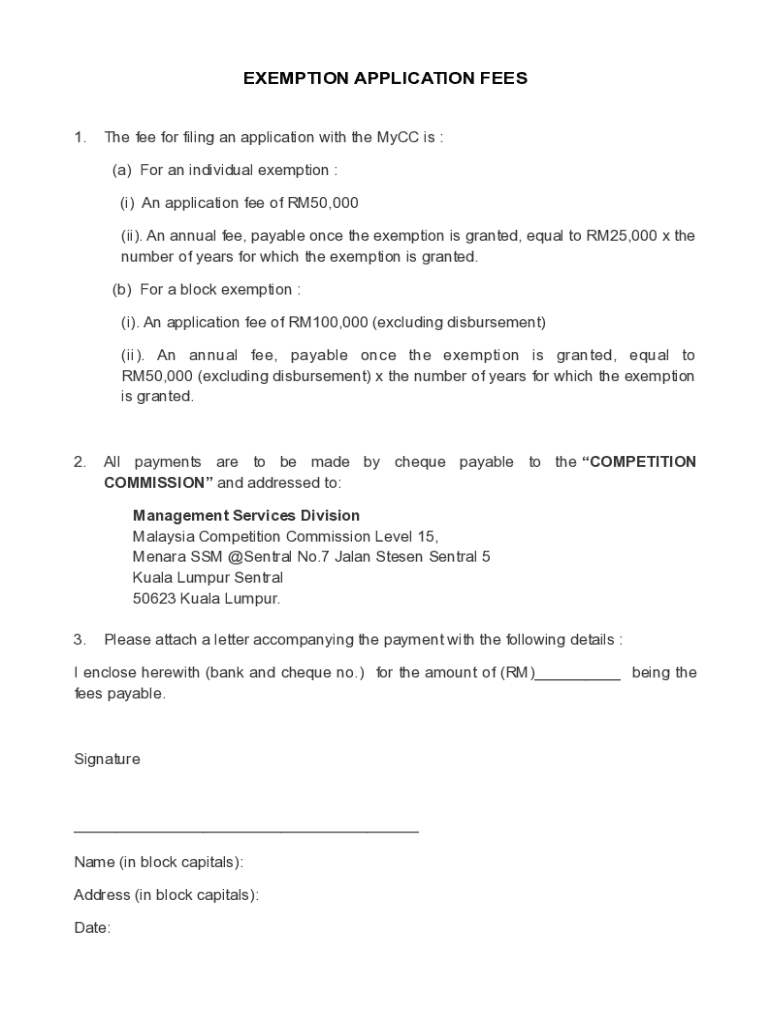 EXEMPTION APPLICATION FEES 1. The fee for filing an application with the CC is : (a) For an individual exemption : (i) An application fee of RM50,000 (ii). An annual fee, payable once the exemption
