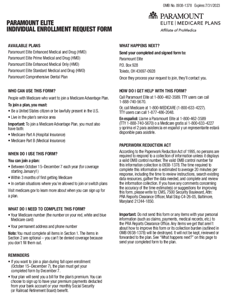 OMB No. 09381378 Expires:7/31/2023PARAMOUNT ELITE INDIVIDUAL ENROLLMENT REQUEST FORM AVAILABLE PLANS Paramount Elite Enhanced Medical and Drug (HMO) Paramount Elite Prime Medical and Drug (HMO) Paramount