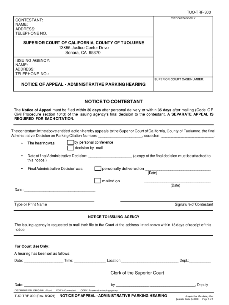 TUOTRF300 FOR COURT USE ONLYCONTESTANT: NAME: ADDRESS: TELEPHONE NO.SUPERIOR COURT OF CALIFORNIA, COUNTY OF 12855 Justice Center Drive Sonora, CA 95370 ISSUING AGENCY: NAME: ADDRESS: TELEPHONE NO.: