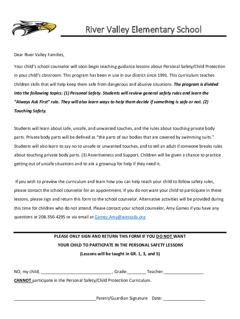 River Valley Elementary School Dear River Valley Families, Your children school counselor will soon begin teaching guidance lessons about Personal Safety/Child Protection in your children classroom.