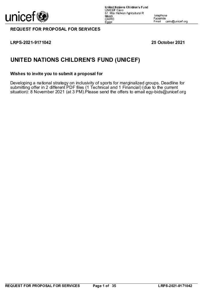 United Nations Children\'s Fund UNICEF Cairo 87, Miss Helen Agricultural R Telephone Mahdi Facsimile CAIRO Email cairo@unicef.org ___ EgyptREQUEST FOR PROPOSAL FOR SERVICES LRPS2021917104225 October